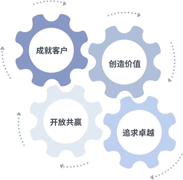 成就客户是一切决策的出发点,,创造价值是衡量所有工作的标准,,,,追求卓越是我们做事做人的态度,,开放共赢是我们的格局也是最终的结果。。。价值观的齿轮环环相扣,,,推动着组织里的每个人不断向前。。。