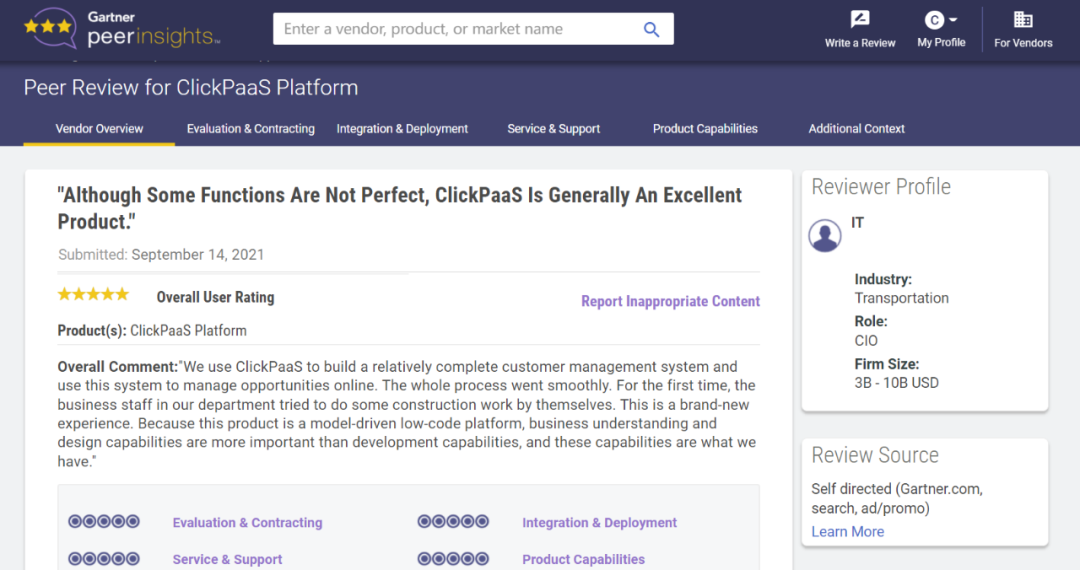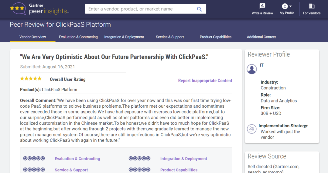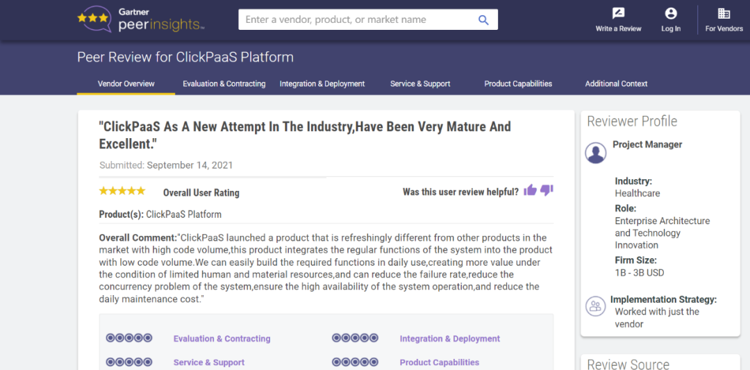 Tips:::::::::【Peer Insights】——用户对企业IT产品和服务发布真实评价的平台。。。。目前已有355个市场,,,,,255,000条经过验证的评价。。。。每一条评价Gartner会针对参评企业营收规模及参评人员信息做验证、、、、、、、、、、、、、评价内容做多维核实。。。。。。。